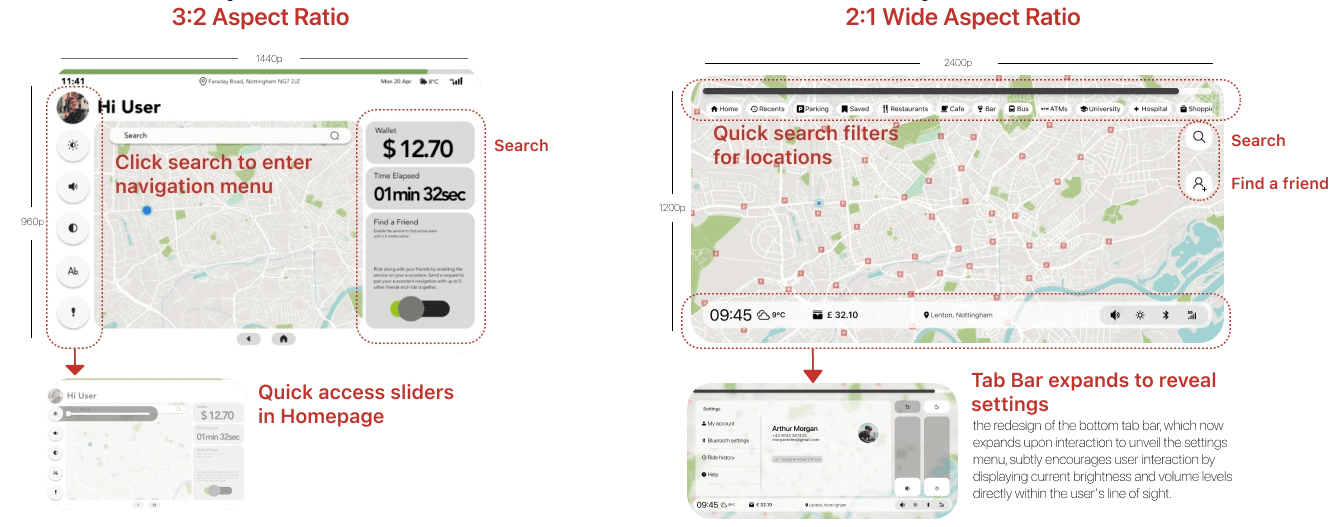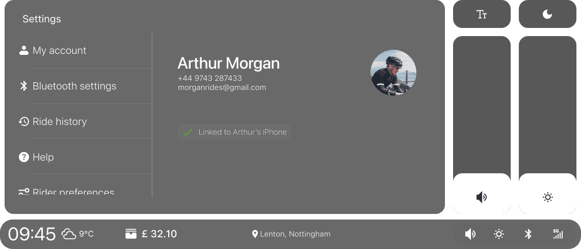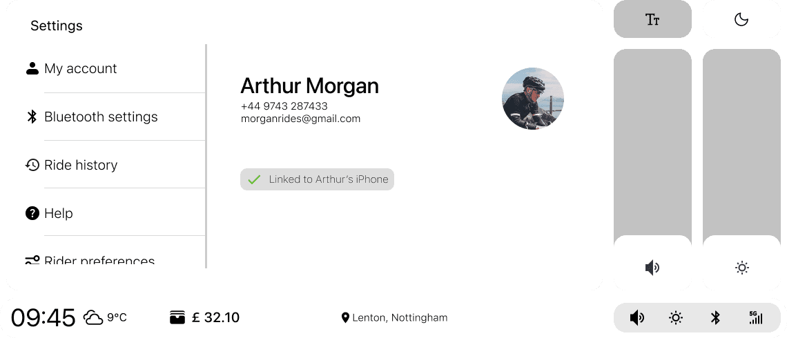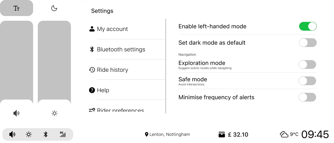 One of the key accessibility features of the device is the Left-Handed Mode, which allows users to inver the UI from left to right. The main icons and quick controls to adjust volume, brightness are placed closer to the users hand to let them use the device while balancing the scooter. The ability to switch the placements of these buttons and control to the left make it easier for left-handed people to use the device.