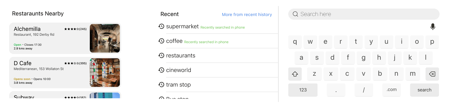 A familiar QWERTY layout is used as the primary input with a provision for voice input to search the name of the destination. The left side of the menu acts as the result tab with recent searches available as default.