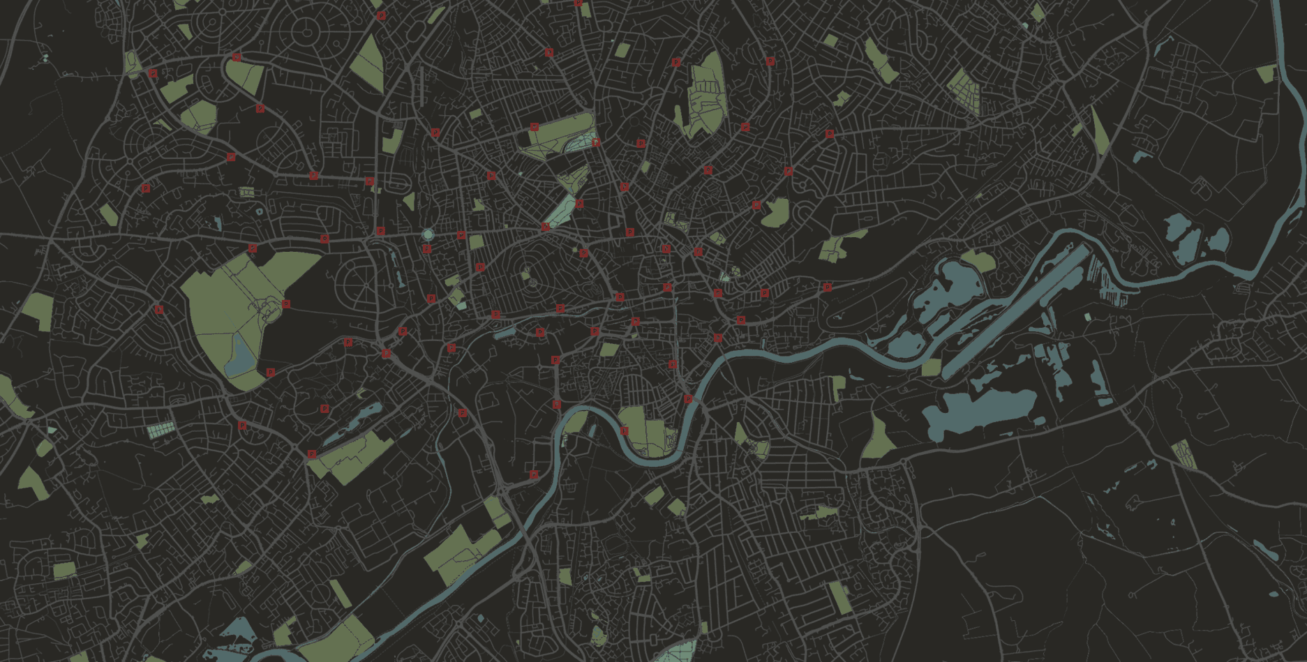 The dark mode adopts a similar map layout. The colours for the roads were chosen to be lighter than traditional maps to minimise irritation to the eyes at night, A relatively small display with high pixel density that contains bright lights in concentrated zones can be jarring to the viewer, especially at night. The contrast ratio of the overlayed menu and map make it ideal to use at daylight as well.
