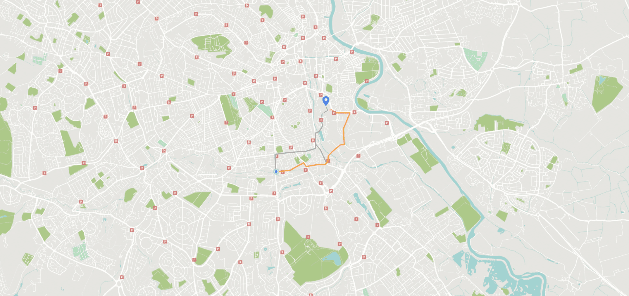 Scooters can be rented at any time of the day and it was important to optimise the user interface to feel comfortable to view at any hour. The light mode features a minimal map design with visual cues to vegetation and water bodies. This allows the user to visually focus on the route, even of only able to view the map for a split second while riding the scooter.