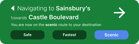 While navigating, the result tab shrinks to only show important information to guide the users travel, with additional options to change the route the user wishes to take.