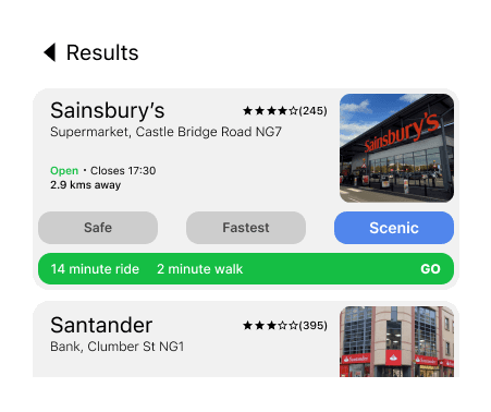 The search results output tab provides key information needed for the user to select the destination of their choice. The user can view the route of the journey by tapping on the destination without having to leave the result tab.