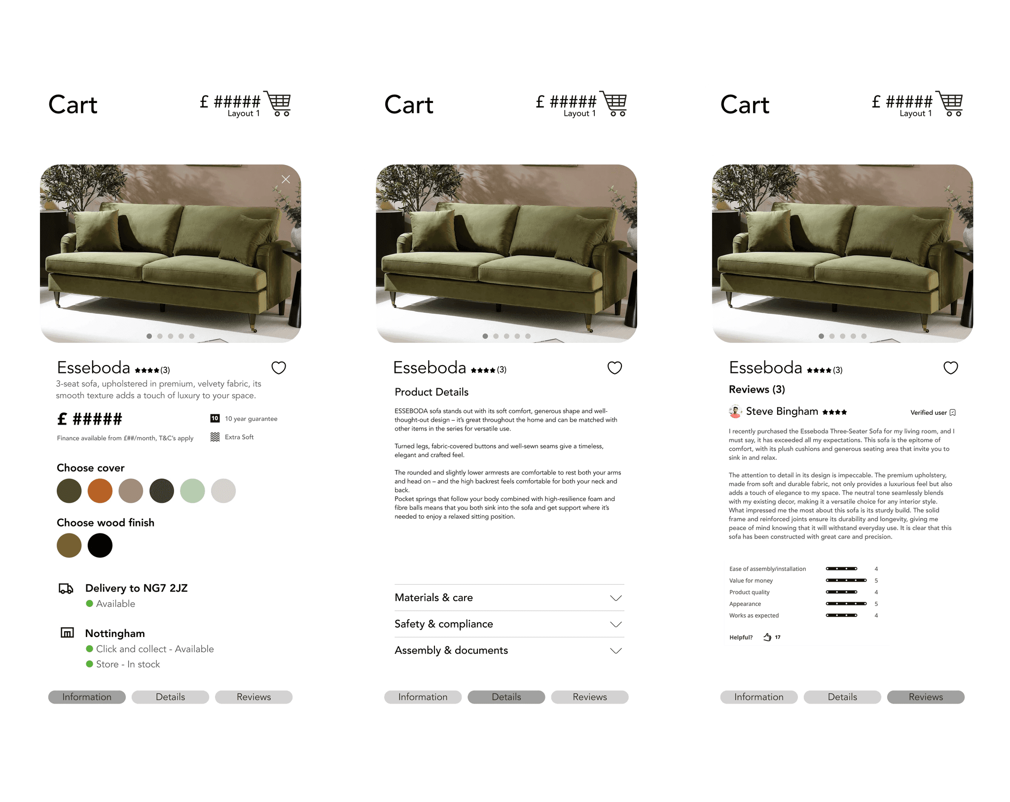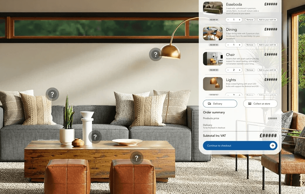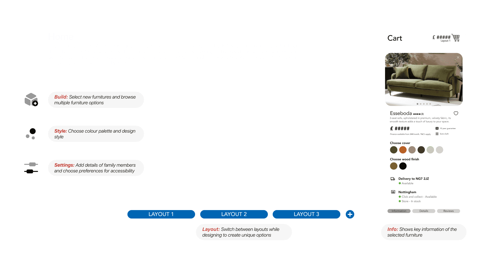 The bottom section allows the user to switch between layouts. The furniture information and cart icons are worldspace elements that can ba placed anywhere in the room.