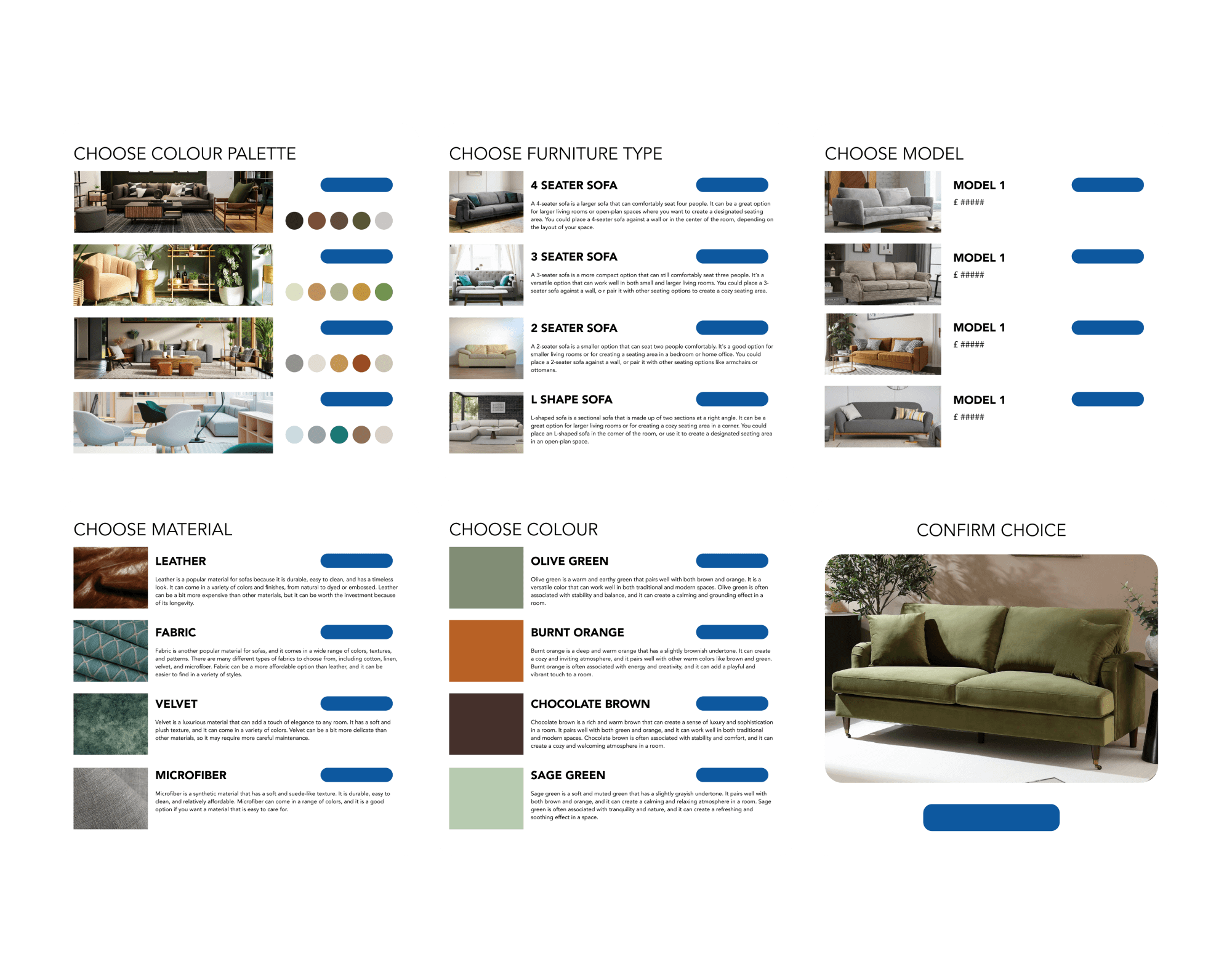 Filter by choosing the desired type, style, model, material, and colour of the furniture based on the colour palettes that was chosen. Once selected, a furniture information card appears upon selection.