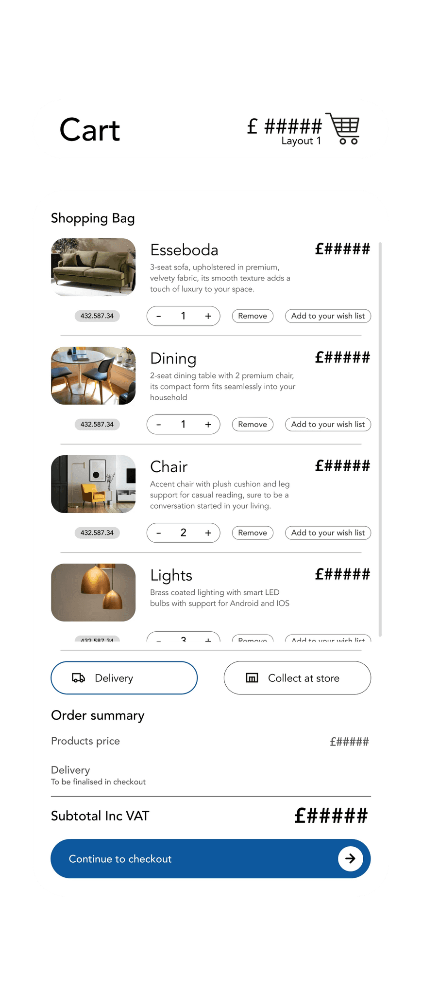 A furniture information card appears to the right when placing or selecting furniture, facilitating quick modifications. The information card is a worldspace element that can placed anywhere in the room. The cart option accompanies the information window. When no furniture is selected, the cart window displays the current cart contents.