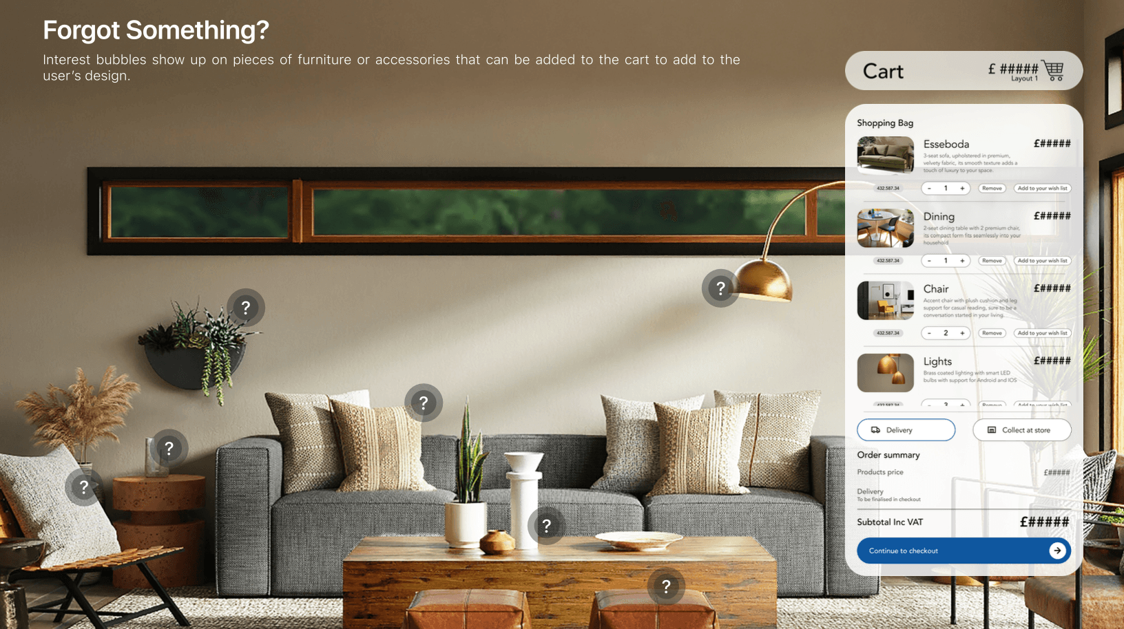 To enhance user engagement, the Cart will feature floating question marks on placed furniture, offering contextual decor suggestions. This intelligent recommendation system helps users complete their space by suggesting complementary items such as rugs, lighting, and accessories—serving as both a design assistant and a subtle marketing tool.